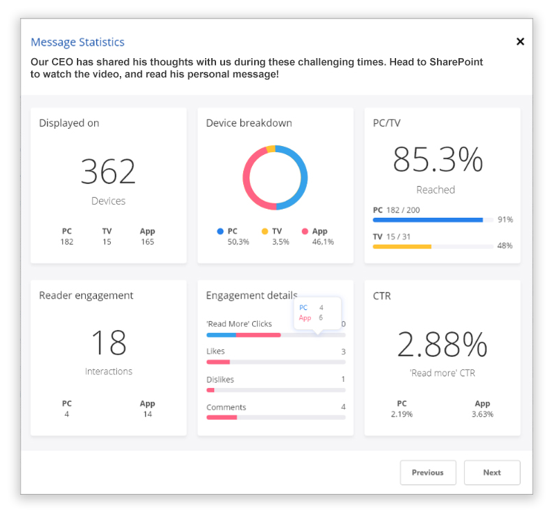 Understanding your employees’ interaction or engagement with your messages will help you understand how your employees consume information. It will give insights into various topics: their preferred communication channels, on which days and during which hours they mostly read your messages, which content they prefer, et cetera.