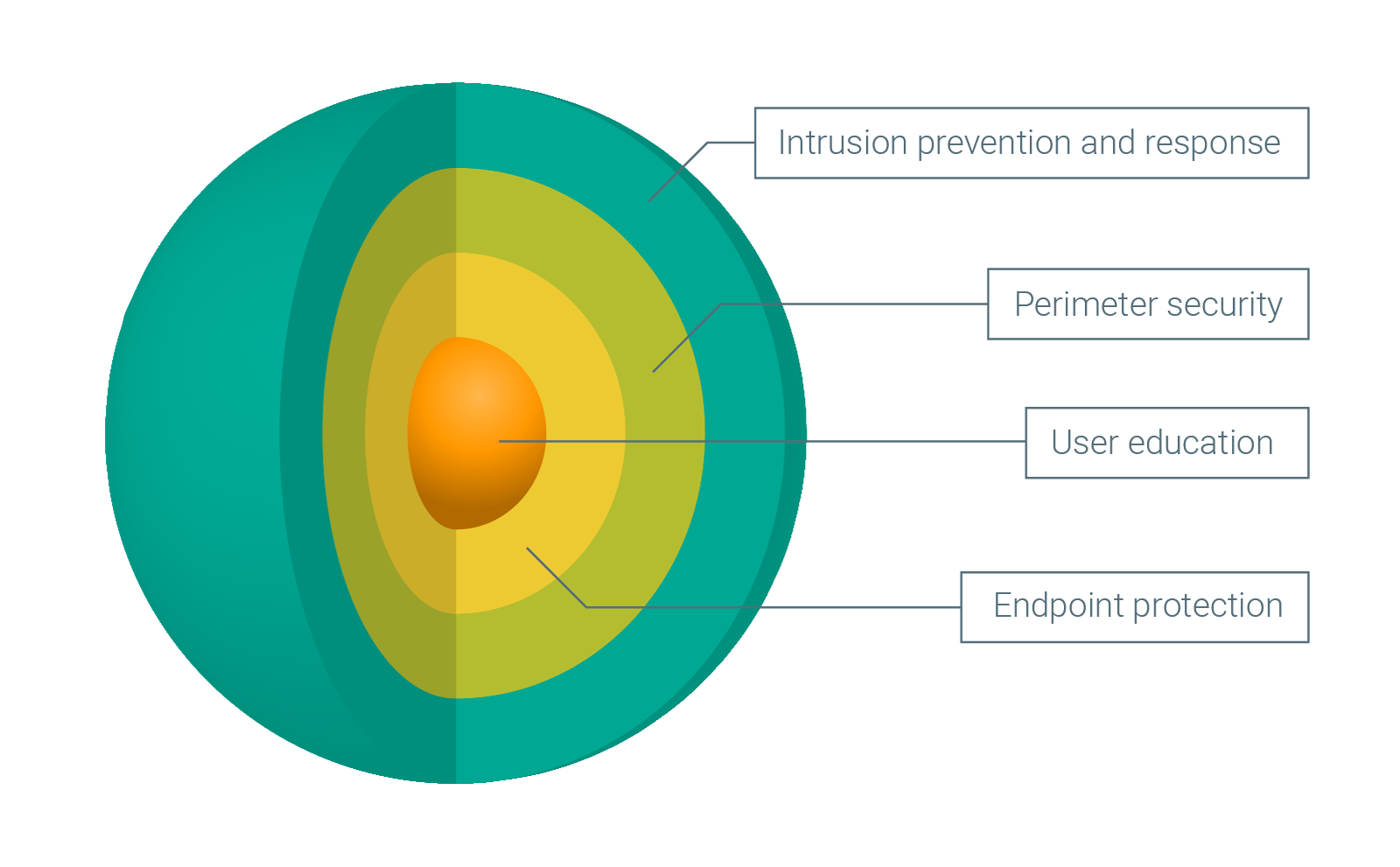 Er is niet één specifieke oplossing om je bedrijfsgegevens uit klauwen van cybercriminelen te houden. Zoals hieronder geïllustreerd, is het juist een combinatie van verschillende benaderingen die je organisatie naar een cyberveilig bestaan leidt.
