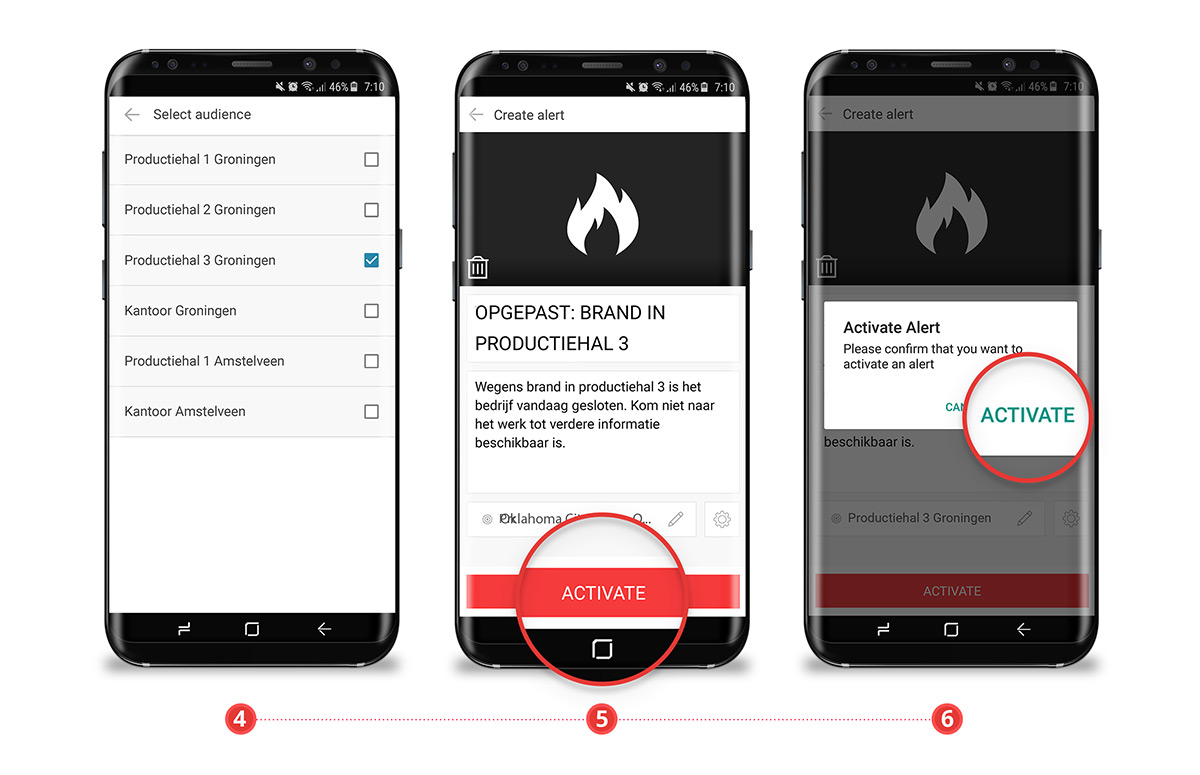 5. Tot slot activeer je het waarschuwingsbericht. 6. Je krijgt nog een laatste bevestigingsbericht, waarna je waarschuwingsbericht onmiddellijk uitgestuurd wordt.