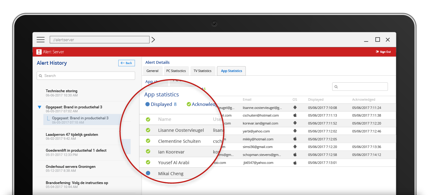 Wanneer medewerkers op de bevestigingsknop klikken, worden hun gegevens automatisch verzameld in een CMS. Hierdoor krijg je een volledig overzicht van de ontvangers, evenals de tijd en datum van de bevestiging. Met deze functionaliteit, kun je medewerkers zelfs vragen om te bevestigen dat ze veilig zijn bij een levensbedreigende calamiteit.