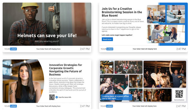 They are designed for both Digital Signage and Screensavers, ensuring a contemporary and professional appearance everywhere. With the ability to add your logo, brand colors, and other visual elements, each template seamlessly aligns with your corporate identity.